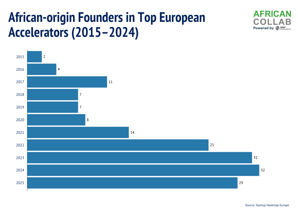 While the numbers were relatively low between 2015 and 2018, we see a clear acceleration from 2021 onwards, with a significant peak in 2023 and 2024. This suggests that African founders are not only increasingly visible, but also more competitive and better positioned to access high-quality international acceleration programs.